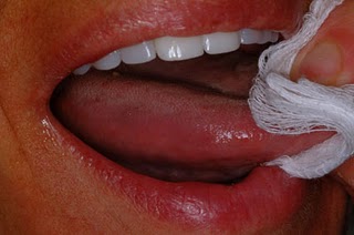 Tome su lengua con una gasa y examínela para ver si tiene protuberancias o cambios de color. Mire la punta, la parte trasera y cada uno de los lados de su lengua.