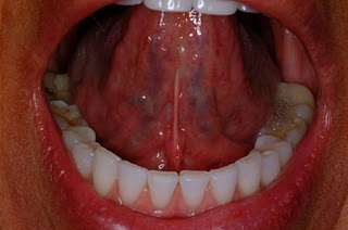 Toque el paladar con la lengua y mire la parte de abajo de la misma y el piso de su boca. Vea si hay cambios de color o protuberancias. Utilice un dedo dentro de su boca y uno por la parte exterior de la misma zona y sienta si hay bultos inusuales, hinchazón o durezas. Importante: Esta guía fotográfica no pretende sustituír un examen y detección dental a fondo realizada por un dentista y sólo se ofrece como guía. Oralcancerselfexam.com y VK Import Ltda. no asumen responsabilidad por la detección de cáncer oral ni por el examen efectuado por quienes utilicen esta guía.