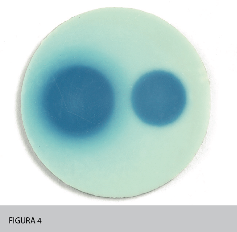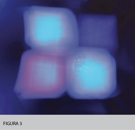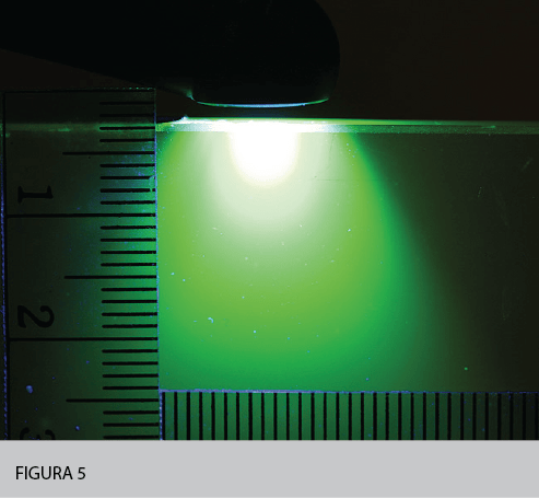 Tiene reflectores recubiertos de rodio que aseguran una mejor colimación de la luz, y un lente interno de vidrio que no decolora afectando la transmisión, ni provoca generación de calor por reflexión. VALO produce un área de polimerización más uniforme y amplia que cualquier otra unidad de fotopolimerización de amplio espectro (Figura 4).