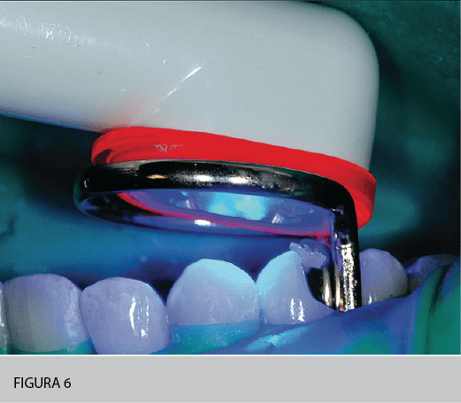 Por eso, es imperativo que, en la distancia, el tiempo de polimerización sea incrementado para compensar. La distancia entre la punta de la lámpara y el piso cavitario de una preparación de Clase II típica, según Price, tiene un rango de 6,3mm con una desviación estándar de 0,7mm en 15% de las restauraciones de más de 8mm de profundidad.(17) Por supuesto, esta distancia puede verse incrementada cuando los anillos de separación o matrices se interponen en el camino de la punta de la lámpara (Figura 6).