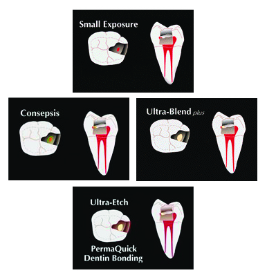 3. Protección pulpar directa – Ultra Blend ha demostrado ser excelente como material de cofiado en las situaciones adecuadas. Si la dentina está rosa (cercana a pulpa) o si hay exposiciones no hiperémicas, sugerimos seguir los siguientes pasos: (si hay exposiciones grandes o pulpa hiperémica, efectuar tratamiento de conductos).