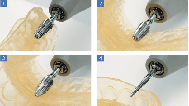 4. Preparar las áreas para el frenillo labial y bucal con la fresa de carburo de tungsteno H261GSQ.104.023