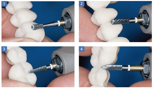 Estas fresas son ideales para trabajar sobre cerámicas y resinas acrílicas. Constituyen una buena alternativa a los pulidores usuales, ya que son capaces de crear superficies siete veces más lisas.