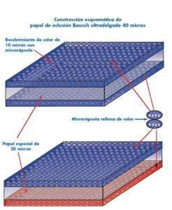 Tienen un recubrimiento especial con colores líquidos (compuesto por muchas microcápsulas pequeñas rellenas de color) que marcan claramente todos los contactos oclusales o interferencias. Incluso una presión masticatoria leve revienta estas cápsulas que liberan el color en forma claramente visible. Las superficies oclusales difíciles o impregnadas de saliva (oro, cerámica, superficies metálicas pulidas o acrílicos) no son un problema (vea el video más abajo). Además, el color se regenera, haciendo posible una marcación repetida con el mismo papel.