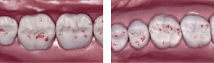 Arti-Fol es ideal para la visualización de la oclusión estática y dinámica en varios colores. 1. En el primer paso se controlan los contactos céntricos (oclusión estática) en rojo, en el segundo paso los contactos excéntricos (oclusión dinámica) en azul. El orden de los colores se puede cambiar. Para una visualización más precisa de la oclusión dinámica se pueden utilizar varios colores.