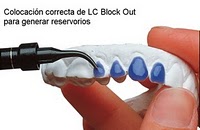 Los reservorios generan un espacio para mantener el gel dentro de la cubeta. Aplique una capa de ~0,5mm de espesor de LC Block-Out sobre las superficies vestibulares deseadas, manteniendo una separación de unos 1.5mm del borde gingival. Para lograr una superficie lisa, aplique en un movimiento de remolino o espiral, sin levantar la punta aplicadora de la resina hasta completar el reservorio. NO se extienda hacia bordes incisales ni superficies oclusales, ya que eso puede causar una separación del borde marginal de la cubeta. Polimerice por aprox. 2 minutos en una unidad de fotocurado ó 20-40 segundos por diente con lámpara de fotocurado manual. Retire la capa de inhibición por oxígeno.