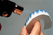 Después de cortar y recortar la cubeta, vuelva a colocarla en el modelo y controle las dimensiones de la misma. Flamée suavemente los bordes, un cuadrante a la vez, con un mechero a gas. Mientras aún se encuentra caliente, presione la periferia de cada segmento firmemente contra el modelo durante tres segundos con el dedo enguantado y húmedo.