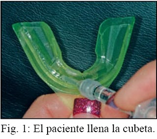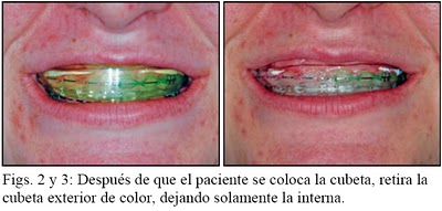 Una paciente de ortodoncia de 22 años, que había estado experimentando dificultades con los cuidados de su boca en casa era la candidata ideal para un tratamiento combinado utilizando nitrato de potasio, flúor y peróxido de carbamida. Ella comprendió le ventaja de los efectos blanqueadores, pero el clínico esperaba ver los beneficios obtenidos en el tejido gingival y los dientes. A la paciente se le instruyó cómo remover la cubeta adaptable predosificada con nitrato de potasio y flúor del embalaje. Luego se le solicitó que colocara una fina línea de peróxido de carbamida PF al 10% entre las dos líneas de P y F que ya se encontraban en la cubeta (Fig. 1, arriba a la derecha). Después de colocar la cubeta en su boca, debía adaptar con suavidad la cubeta exterior de color a sus dientes y luego removerla, dejando la membrana interna, fina y transparente (Figs. 2 y 3, abajo). Se le informó que cuanto más tiempo pudiera tener la cubeta puesta, tanto más rápido se llevaría a cabo el blanqueamiento. Se le entregó suficiente material para 10 días (de ambos productos: cubetas predosificadas de PF y jeringas de peróxido de carbamida al 10% con PF.