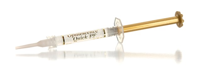 Opalescence Quick 45% PF es un blanqueamiento para la sala de espera o el sillón odontológico para utilizar en una cubeta individual. Es un gel claro, muy viscoso y pegajoso (se adhiere a los dientes y a la cubeta) de peróxido de carbamida al 45 % (pH~6.0). Recomendamos su uso para retoques, como tratamiento inicial previo al blanqueamiento domiciliario o para enseñanza del procedimiento domiciliario.