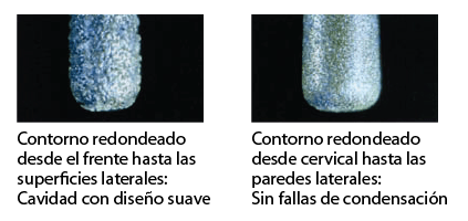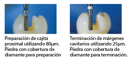 La variación en los tamaños de las partículas de diamante (y/o piedras) permite la preparación y terminación tanto de cavidades grandes como conservadoras.