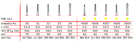 Las piedras destinadas a reducir la circunferencia de los dientes pilares tienen una granulometría constante de entre 75mu y 90mu. Debido a su diámetro estandarizado de 1,2mm permiten alcanzar el tallado elegido en forma racional y atraumática. Esto incluye coronas totales metálicas, coronas metalo-cerámicas y coronas de cerámica alumínica (Al2O3) libres de metal.