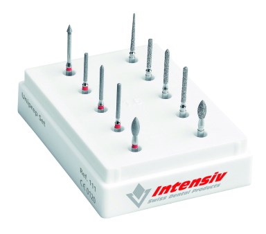 El set consta de 10 piedras de diamante FG, para sistematizar estos procedimientos en el consultorio privado. La relación ideal de tamaño, forma y grosor de grano de estos diamantes permite un desgaste dentario superficial biológico y racional en menos tiempo.