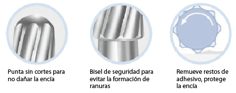 Estos instrumentos tienen punta inactiva para evitar daños a la encía. El bisel de seguridad en la base de la cabeza elimina la formación de ranuras.