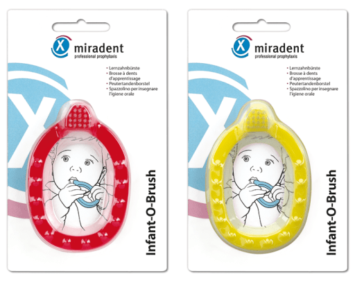 Mordillo y cepillo dental de enseñanza a través del juego, para niños hasta 3 años. Cerdas extremadamente suaves para evitar daños gingivales. Sin peligro de ingestión. Amarillo o rojo.