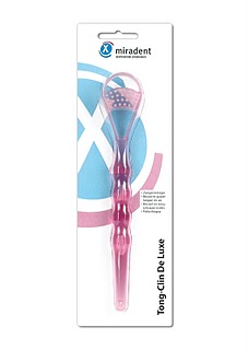 Raspador de lengua con cepillo. Disponible en rosa transparente y celeste transparente.