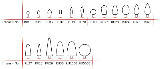 Las puntas de rubí de alta calidad (con partículas de rubí fijadas por procedimiento galvánico) son indicadas para el raspado fino de aparatos odontológicos con base acrílica; en prótesis: especialmente para la conformación interproximal y la eliminación de puntos de presión.