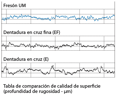 Los ensayos en el laboratorio confirman que la calidad de la superficie lograda con fresones UM sobrepasa en calidad a las superficies generadas con fresones de dentadura en cruz convencional (dentadura E) y generan superficies iguales a las logradas con un fresón de dentadura fina (EF).