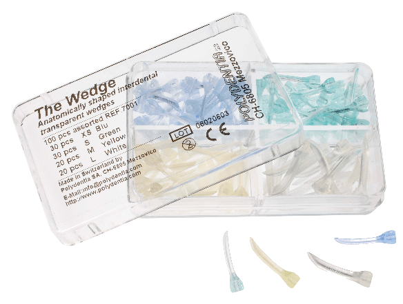 “The Wedge» es una nueva cuña interdental transparente fabricada en una mezcla especial de polímeros elásticos (elastómeros) termoplásticos.