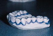 Se toma una impresión. Con resina LC Block Out se generan reservorios sobre el modelo de yeso, pero exclusivamente en las zonas afectadas. La parte superior o inferior de la cubeta se recorta en forma recta, cubriendo la encía.